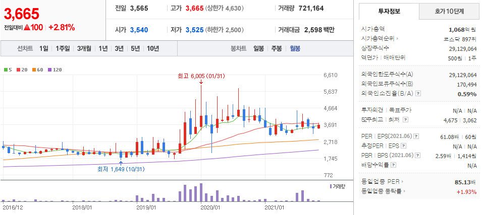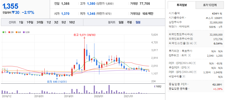 대한뉴팜 ( 054670 : 코스닥 ) - 월봉 / 네이버금융 참고