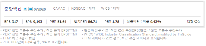 중앙백신 (072020 : 코스닥 ) / 네이버금융 참고