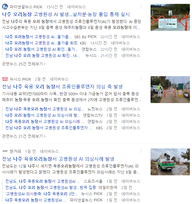 고병원성 조류인플루엔자(AI) 발생 관련 기사 / 네이버뉴스 참고