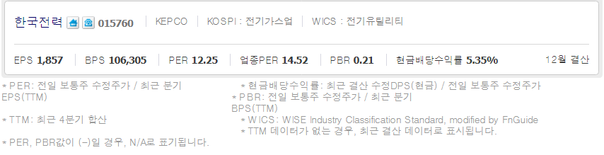 한국전력 ( 015760 : 코스피 ) / 네이버금융 참고