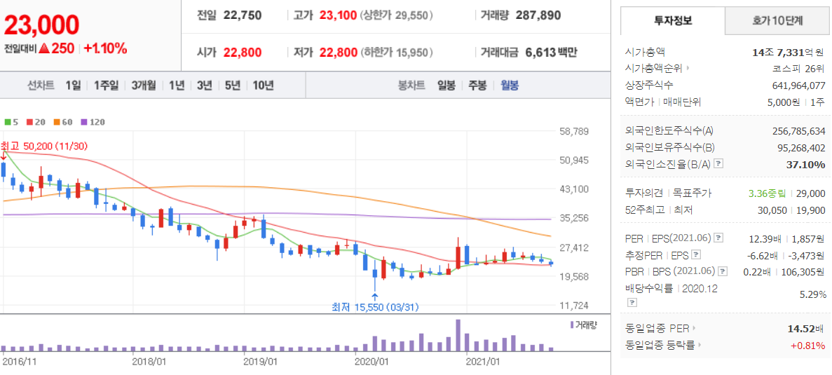 한국전력 ( 015760 : 코스피 ) - 월봉 / 네이버금융 참고