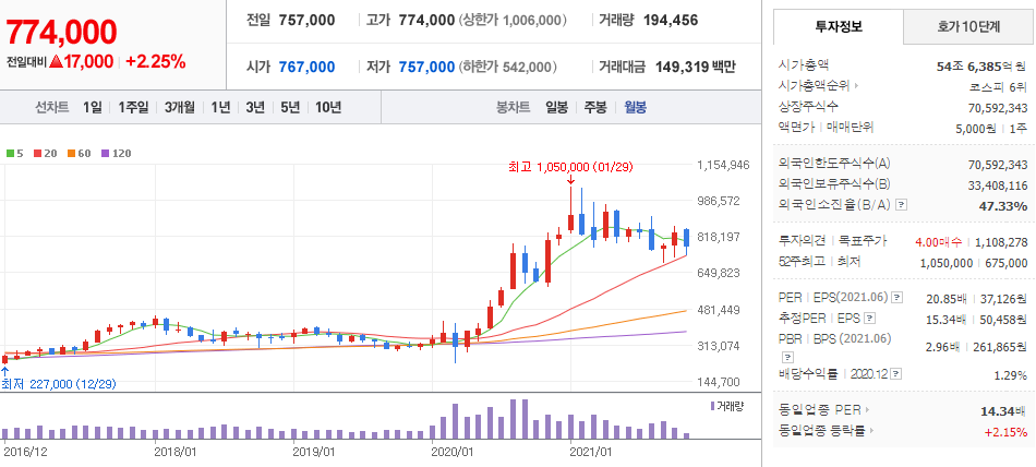 LG화학 (  051910 : 코스피 ) - 월봉 / 네이버금융 참고
