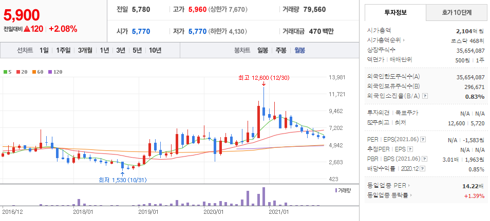 성창오토텍 (  080470 : 코스닥 ) - 월봉 / 네이버금융 참고