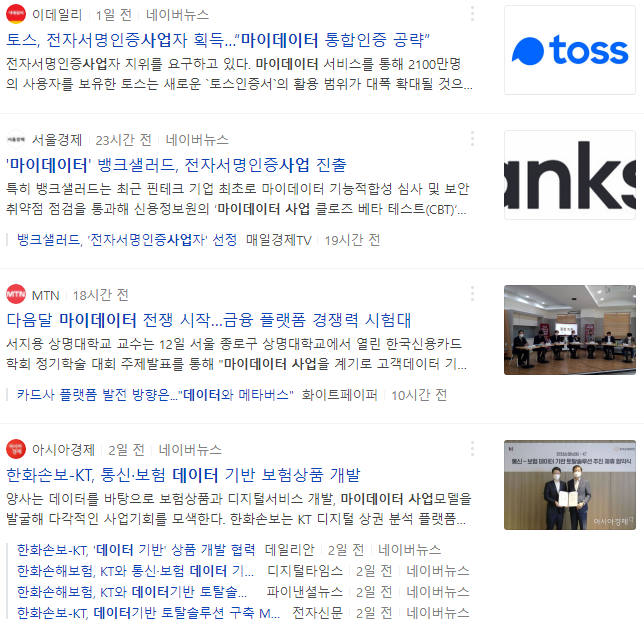 마이데이터 사업 - 금융사나 통신사, 또는 병원 등 여러 기관에 분산되어 있는 개인의 정보를 한 곳에 모아 제3의 서비스 사업자에게 제공하는 비즈니스를 의미합니다. 데이터 3 법(개인정보보호법·신용정 보법·정보통신망법) 개정으로 2021년 8월부터 데이터 기업 사업자들이 개인의 동의를 받아 금융정보를 통합 관리해주는 마이데이터사업(신용정보관리업)이 가능해졌습니다.