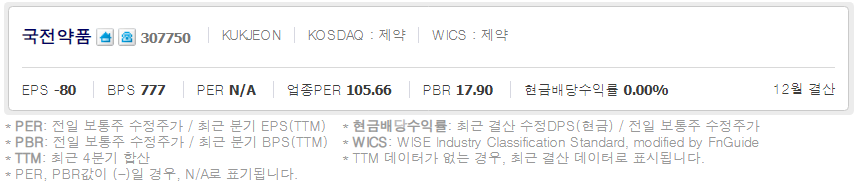 국전약품 ( 307750 : 코스닥 ) - 11월 30일 장 마감 기준