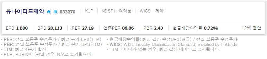 유나이티드제약 ( 033270 : 코스피 ) - 11월 30일 장 마감 기준