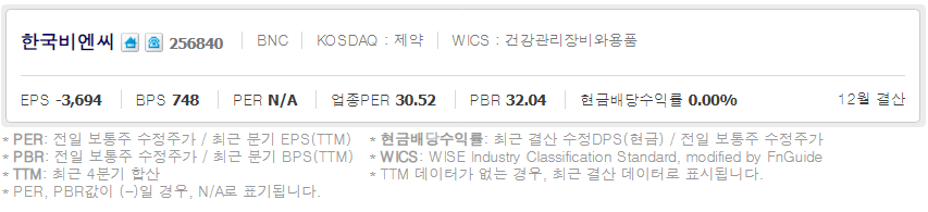 한국비엔씨 ( 256840 : 코스닥 ) - 11월 30일 장 마감 기준