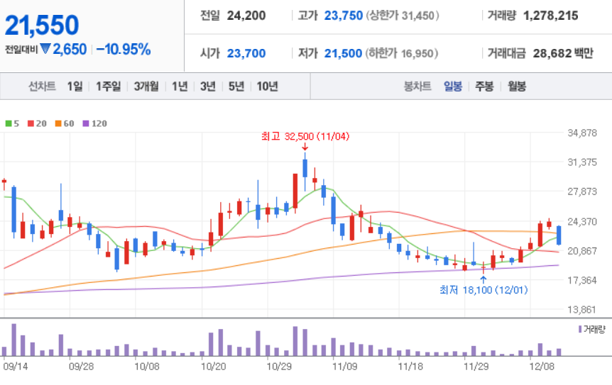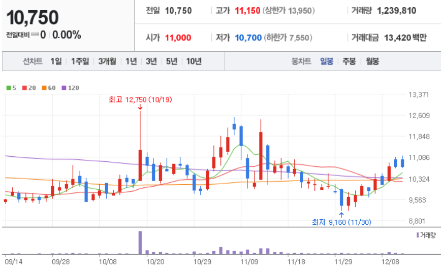 한올바이오파마 ( 009420 : 코스피 ) - 12월 13일 장 마감 기준
