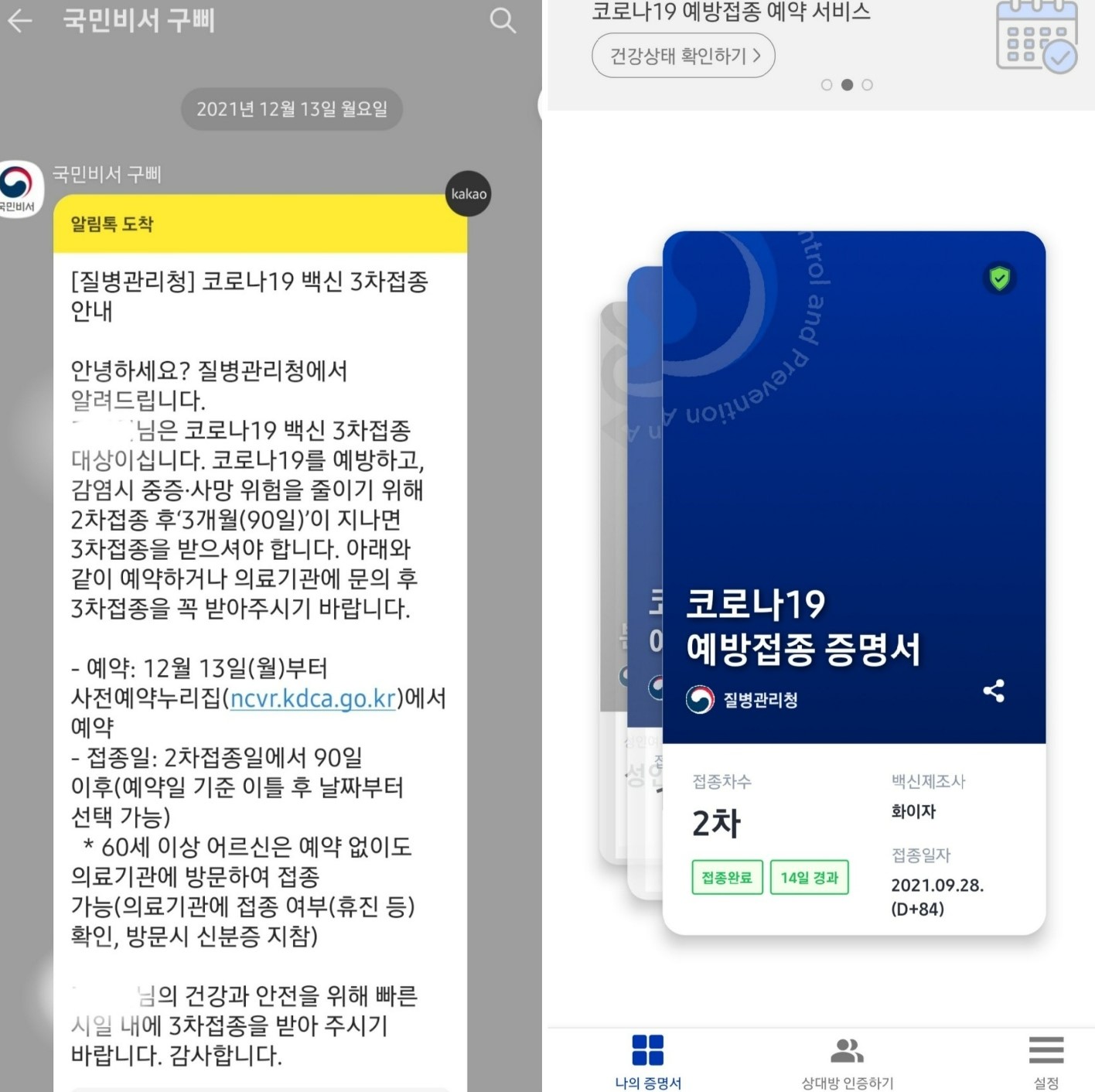 - 2차 접종자에게는 유효기간 만료 14일, 7일, 1일 전 국민 비서 알림 안내가 됩니다.