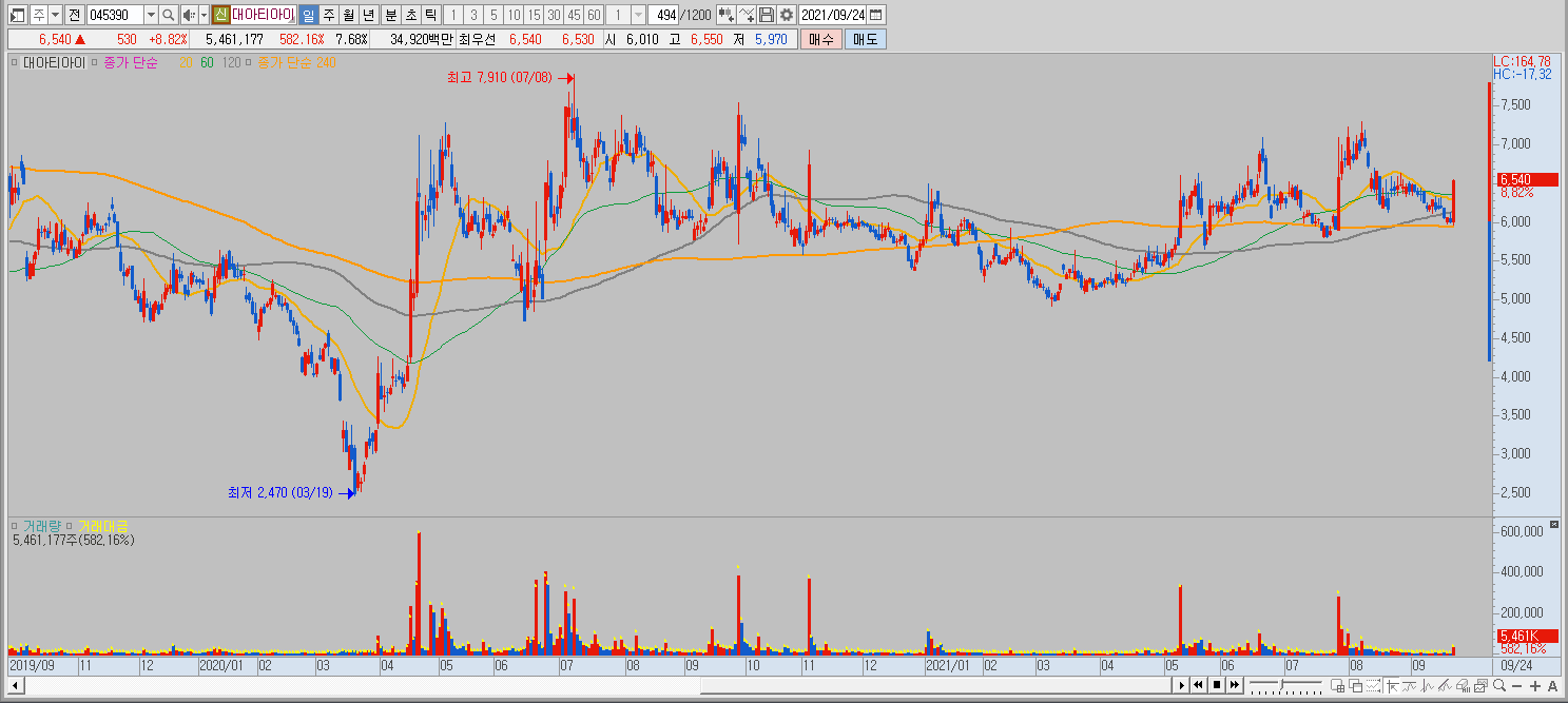 대아티아이 045390 | 홈페이지 홈페이지http://www.daeati.co.kr 전화번호 전화번호032-680-0800 | IR 담당자 032-680-0937 주소 주소경기도 부천시 오정구 수도로 139 (내동) KOSDAQ 코스닥 제조 코