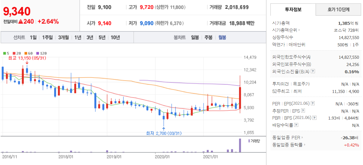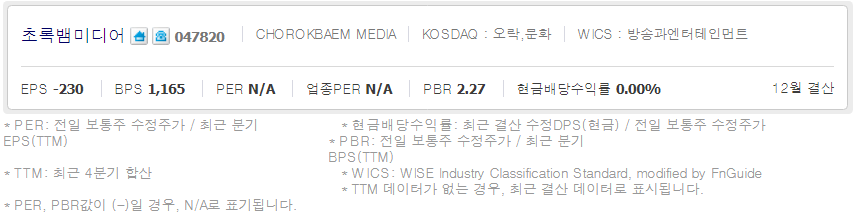 초록뱀미디어 (  047820 : 코스닥 ) / 네이버금융 참고