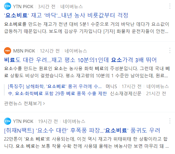 현재 요소수 대란으로 요소비료 품귀 현상도 우려가 되며 내년 농사 비료값이 걱정되는 상황입니다.
