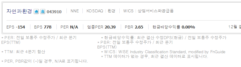 자연과 환경 (  043910 : 코스닥 )/ 네이버금융 참고