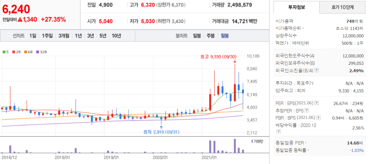 자연과 환경 (  043910 : 코스닥 ) - 월봉 / 네이버금융 참고
