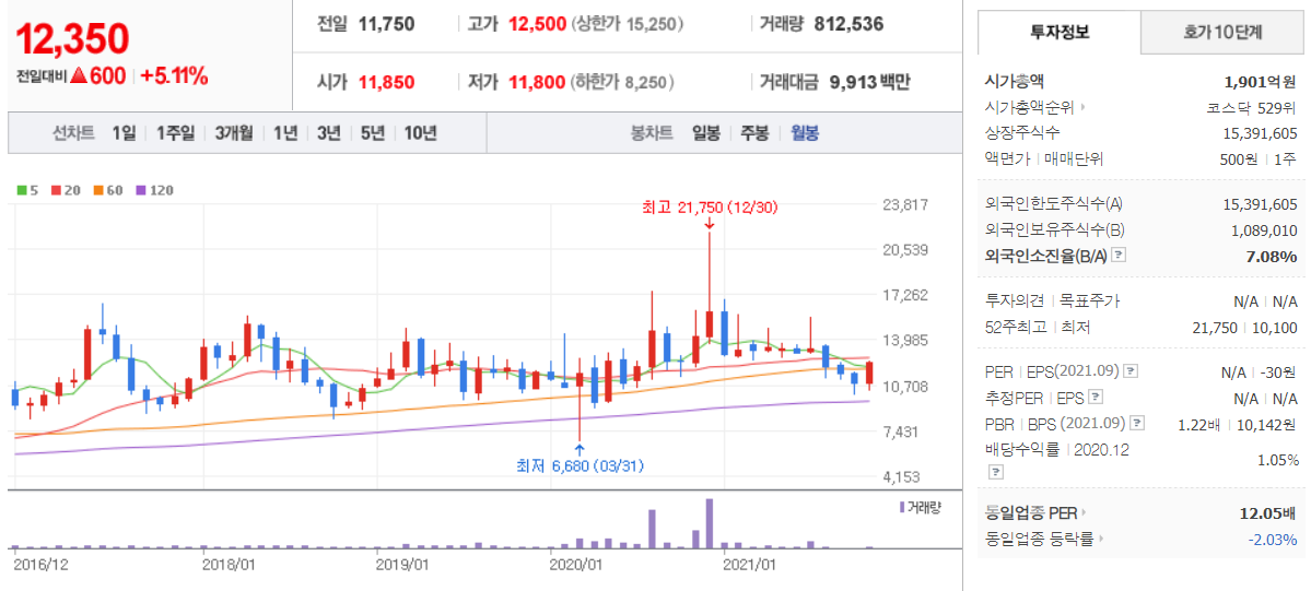 상아프론테크 (  089980 : 코스닥 ) - 월봉 / 네이버금융 참고