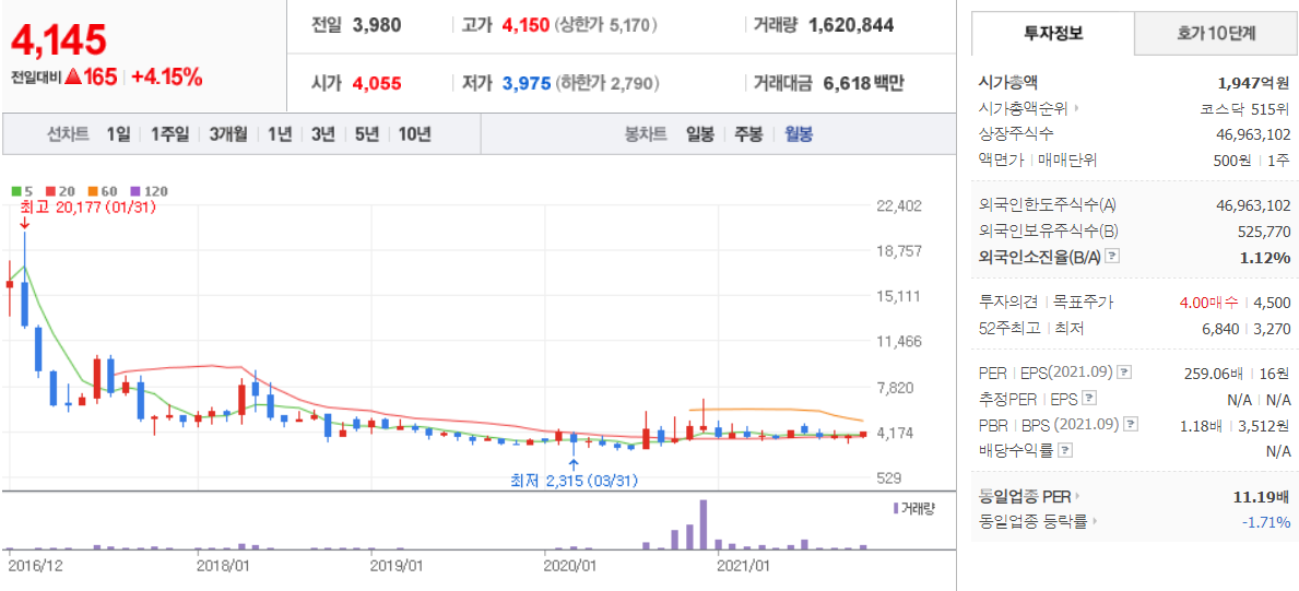 에스와이 (  109610 : 코스닥 ) - 월봉 / 네이버금융 참고
