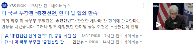 지난 9월 문재인 대통령이 유엔 총회에서 종전 선언을 제안한 이후 우리 정부가 미국과 논의를 지속한 가운데 처음으로 미국의 긍정적인 반응을 얻어내 기대감이 모아지고 있으며 통일부에서는 종전선언은 한반도 평화 프로세스를 진전시키고 비핵화 협상을 촉진하고 남북관계 발전으로 이어가는데 의미 있는 중요한 조치라는 인식을 가지고 미국과 협의를 해왔고 이번 한미일 협의도 그 일환이며 이 협의가 진행되는 데에 따라 논의가 실질적인 성과로 이어질 수 있는 필요한 준비도 이어가고 있다고 했습니다.