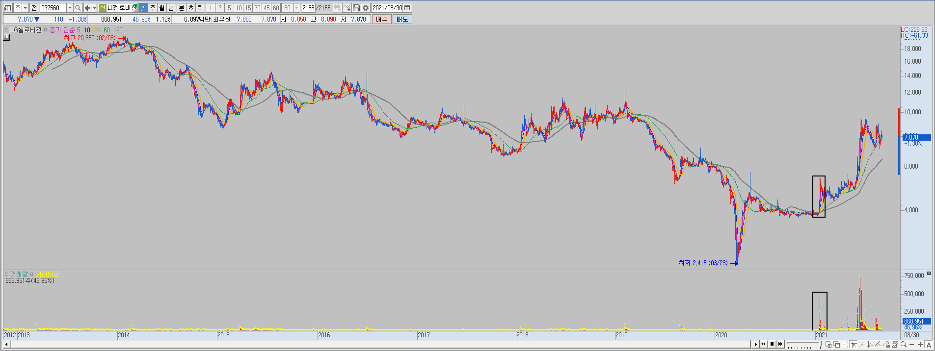 역사적 거래량인 20년 7월 20일, 21일 상한가, 다음날 윗꼬리 부분이 의미 있는 자리가 되겠습니다.