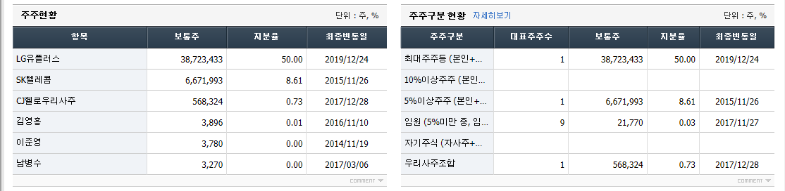 최대주주도 "LG유플러스"로 대기업이 50%나 지분율을 가지고 있는 모습입니다.