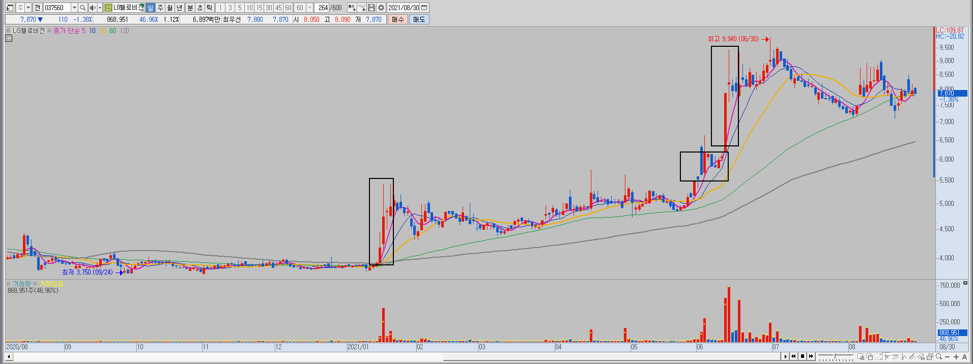 당시 재료도 합병 재료였고 괜찮은 재료였습니다 일봉상 상당히 낮은 위치, 역대 최고 거래대금