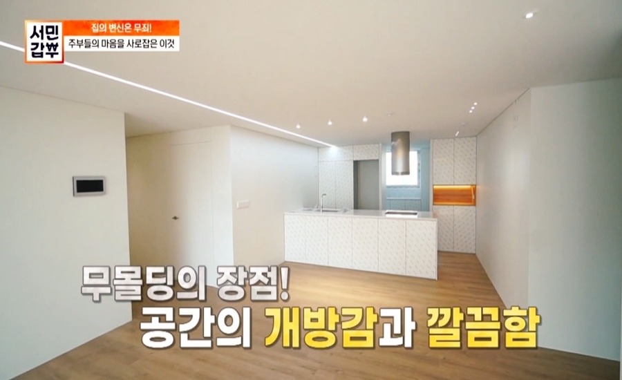 몰딩이란 창틀이나 공간의 면과많이 만나는 부분을 장식하는 방법인데요 올드해 보이는 단점에 비해 무 몰딩은 천장 몰딩으로 인해 가구와 디자인과 부딪히는 부분이 없어 공간의 개방감과 깔끔함을 자랑합니다