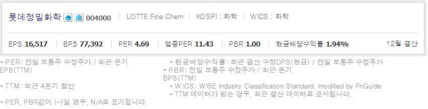 롯데정밀화학 ( 004000 : 코스피 ) - 12월 16일 장 마감 기준