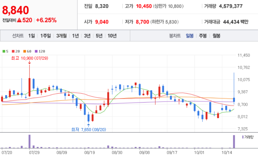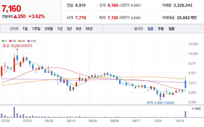 KC코트렐 ( 119650 : 코스피 ) - 일봉 / 네이버금융 참고