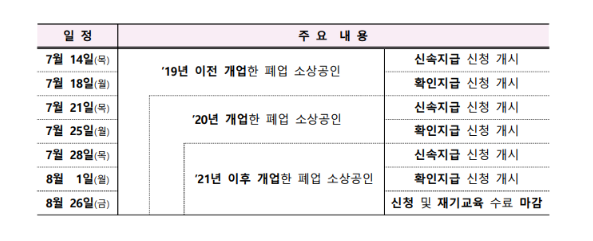 폐업점포 재도전장려금.kr 홈페이지를 통해 온라인 신청 가능합니다. 중기부 데이터베이스에 선별된 사업체는 신속 지급으로 당일 지급하며 서류 제출이 필요한 확인 지급 업체는 3~4일 시간이 더 걸릴 수 있습니다. 14일 부터 8월 26일까지 신청이며 선착순 마감이기 때문에 미리 서류 등 확인이 필요합니다.장려금 신청 및 재기교육 모두 주말과 공휴일 상관없이 폐업점포재도전장려금 누리집(폐업점포재도전장려금.kr)을 통해 가능
