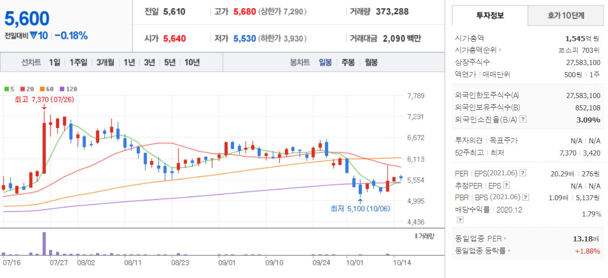 2. 경동나비엔 ( 009450 : 코스피 ) / 10월 15일 장 마감 기준