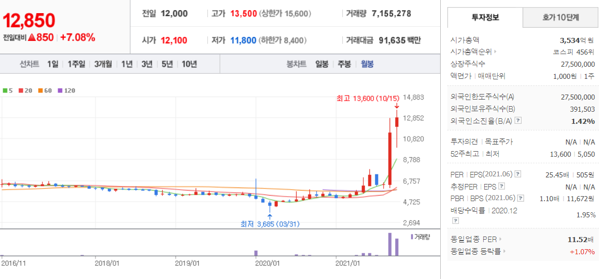 태경비케이 (  014580 : 코스피 ) - 월봉 / 네이버금융 참고