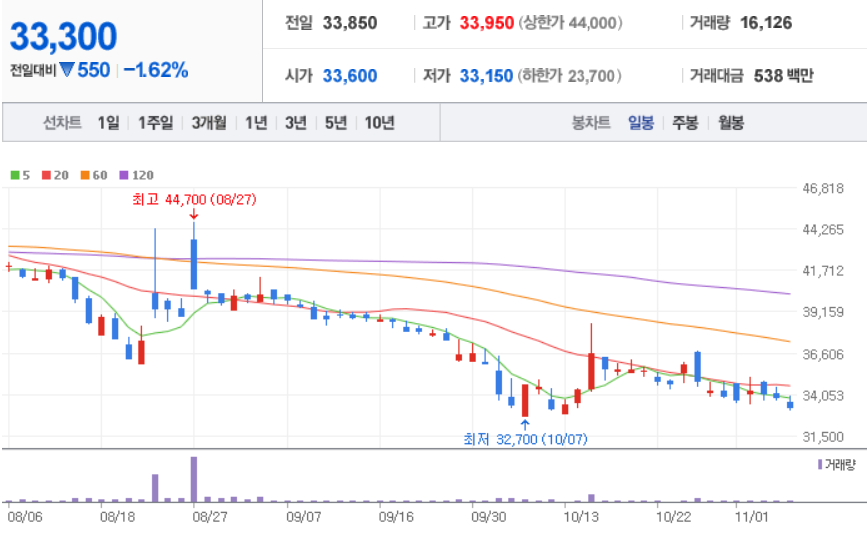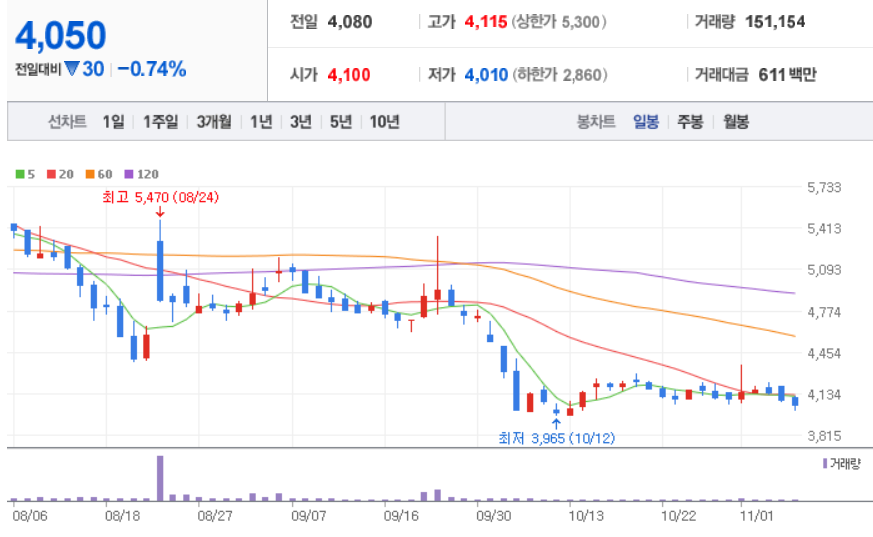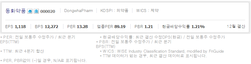 동화약품 ( 000020 : 코스피 ) - 11월 5일 장중 마감 기준