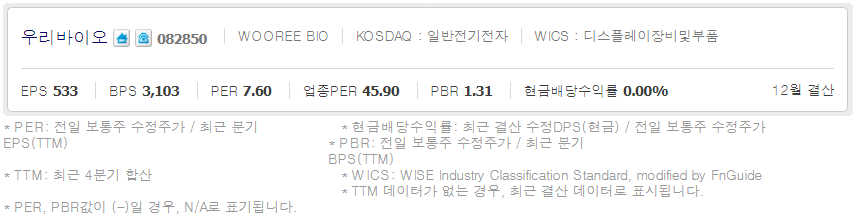 우리 바이오 ( 082850 : 코스닥 ) - 11월 5일 장중 마감 기준