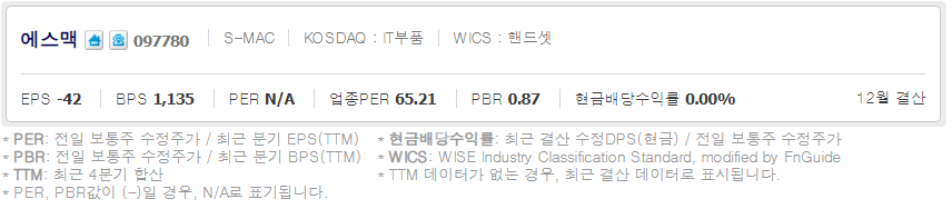 에스맥 ( 097780 : 코스닥 )  - 12월 7일 장 중 기준