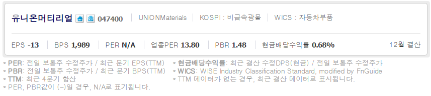 유니온머티리얼 ( 047400 : 코스피 ) - 12월 7일 장 중 기준