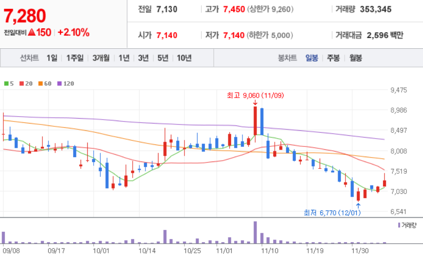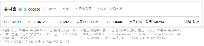 유니온 ( 000910 : 코스피 ) - 12월 7일 장 중 기준