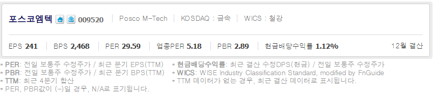 포스코엠텍 ( 009520 : 코스닥 ) - 12월 7일 장 중 기준