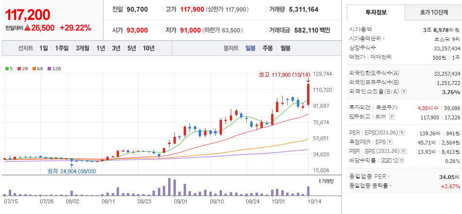 모바일 게임 ‘미르 4’의 글로벌 흥행 소식에 주가가 급등하며 52주 최고가를 경신했습니다.  블록체인 기술을 적용해 암호화폐의 현금화가 가능해진 시스템이 게임 유저들의 주목을 끄는 데 큰 힘이 되었고 올 4분기 신작 ‘미르 M’의 출시가 예정되어 있어 흥행 시 추가 상승 모멘텀으로 작용될 것으로 기대됩니다. 지난 9월 13일 1주당 1주를 추가 배정하는 무상증자를 실시하면서 주당 가격이 기존의 절반 수준(종가 5만 9,000원)으로 줄어들었지만 ‘미르 4’ 효과로 무상증자 전 가격대로 도달했습니다. 올해 8월 글로벌 서비스를 시작한 위메이드의 모바일 다중접속 온라인 역할 수행 게임(MMORPG) ‘미르 4’가 동시 접속자 수 80만 명을 돌파하며 흥행세를 숫자로 증명해내자 위메이드가 부각된 걸로 확인됩니다. 초반에 출시 당시 ‘미르 4’ 글로벌 버전의 서버 수는 당시 11개였지만 이용자가 빠르게 증가하면서 현재는 136개 수준으로 늘어났습니다.