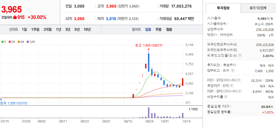 중국 최악의 전력난이 공업생산 차질을 넘어 식자재 원가 등에도 영향을 미치면서 미래 생명자원이 부각되었습니다. 중국 북부 및 북동부의 콩 파쇄 공장 절반 이상이 9월 말부터 국경절 연휴까지 문을 닫았고 국경절 이후에도 상당수가 문을 열지 않았으며 공장 폐쇄 이유는 정확히 알려지고 있지 않지만, 석탄 수급 차질로 인한 전력난 때문으로 추측이 됩니다. 10월 13일 정저우 상품거래소에서는 내년 1월 인도분 발전용 석탄 가격이 한때 역대 최고가인 톤 당 1640위안(약 30만 원)까지 치솟았습니다. 콩은 목축과 양식업 사료로 가장 많이 쓰이는 농작물로 중국은 세계 최대의 콩 소비 국가입니다. 콩 수급 문제로 사료 생산에 차질이 빚어질 경우 중국인들의 기본 식재료인 생선, 돼지고기 등의 가격에도 악영향이 예상되고 이 때문에 축산 및 사료 전문업체인 미래 생명자원의 주가 상승의 이유이기도 합니다.