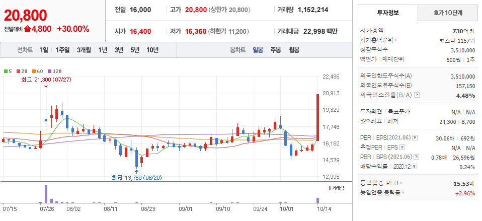 2. 한일화학 ( 007770 : 코스닥 ) + 30.00 %