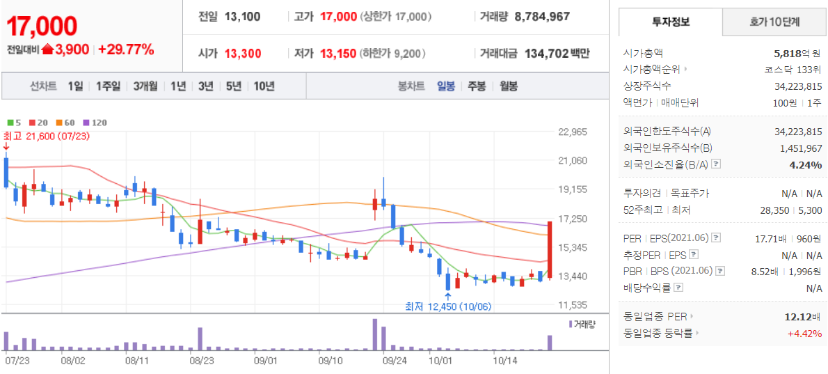 5. 엔피 ( 291230 : 코스닥 ) +18.41 %