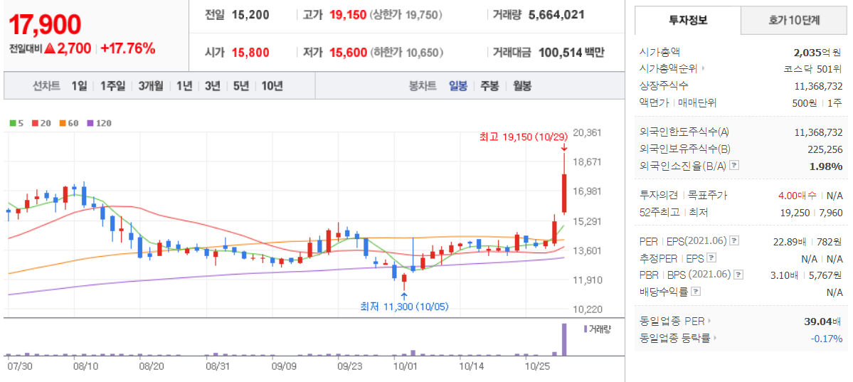 이스트소프트 ( 047560 : 코스닥 ) + 17.76%