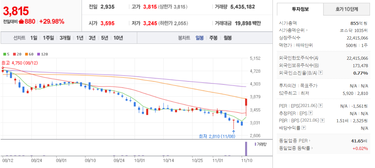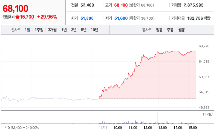 비즈니스온 ( 138580 : 코스닥 ) + 30.00% - 11월 11일 장 마감 기준