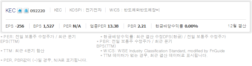 KEC는 반도체 제품 및 부품 제조업을 영위할 목적으로 기존 법인인 주식회사 케이이씨로부터 제조 사업 부분을 2006년 9월 인적 분할하여 설립되었습니다. 초소형 Package 개발, 모바일화 및 디지털화 요구에 부응한 저 소비전력 제품 개발과 미국 및 유럽 시장 등 시장 개척에 총력을 기울입니다. 매출은 TR이 51.06%, IC가 22.77%, 기타(제품)가 21.16%의 비중을 차지하고 있습니다.