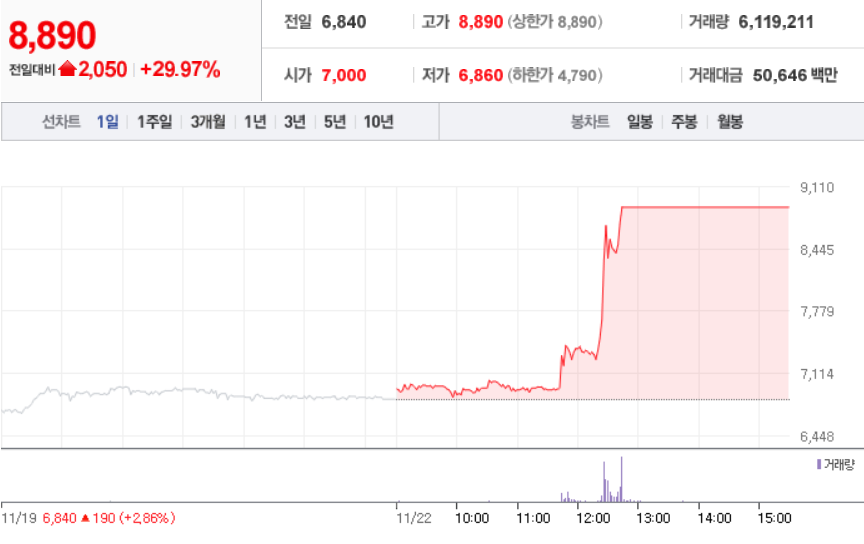 원풍물산 ( 008290 : 코스닥 ) + 30.00 % - 11월 22일 장 마감 기준