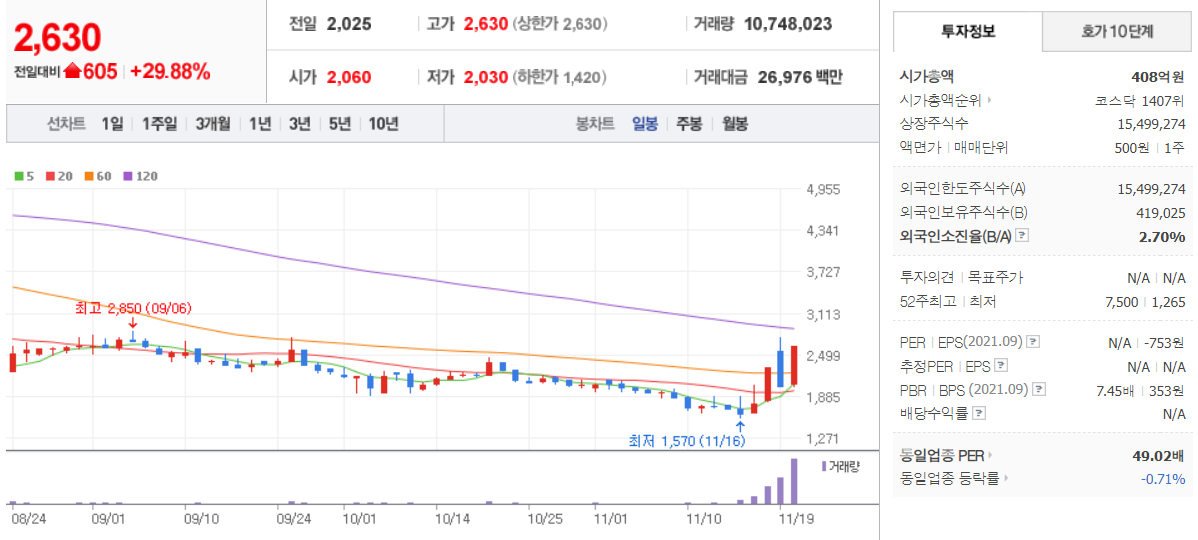 네오위즈홀딩스 ( 042420 : 코스닥 ) + 20.55 % - 11월 22일 장 마감 기준