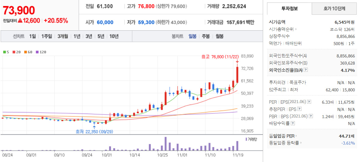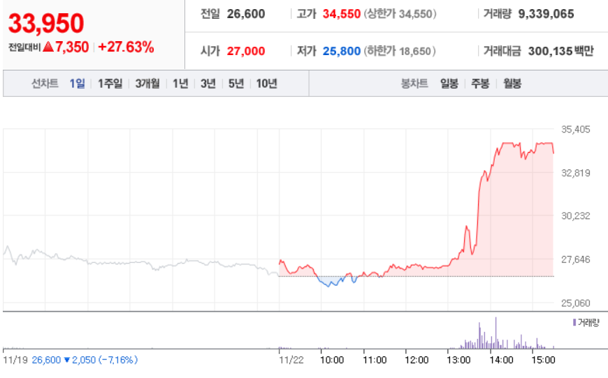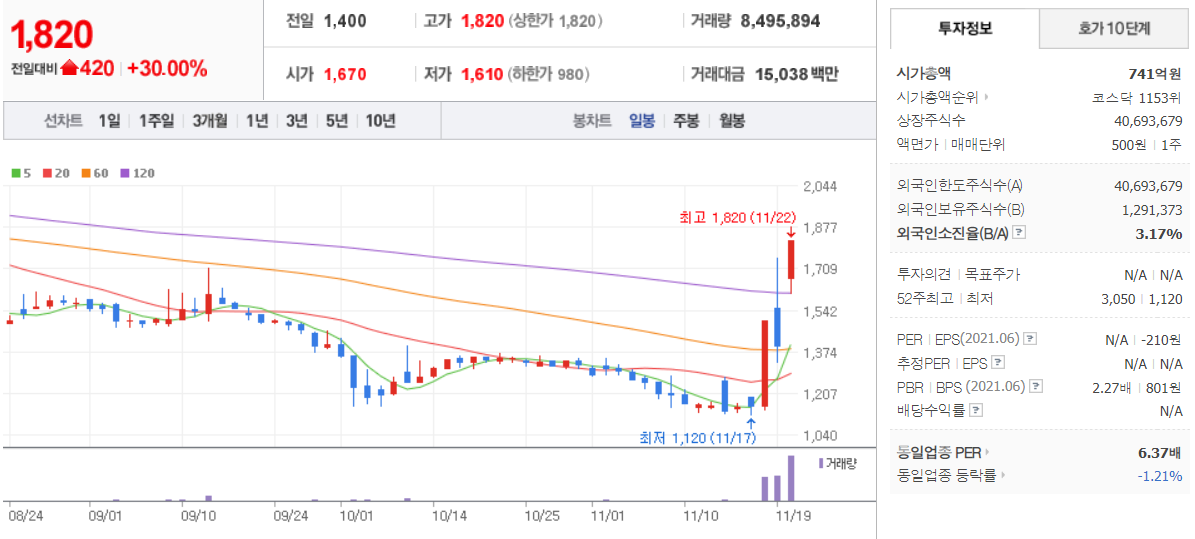 네오위즈홀딩스 ( 042420 : 코스닥 ) + 20.55 % - 11월 22일 장 마감 기준