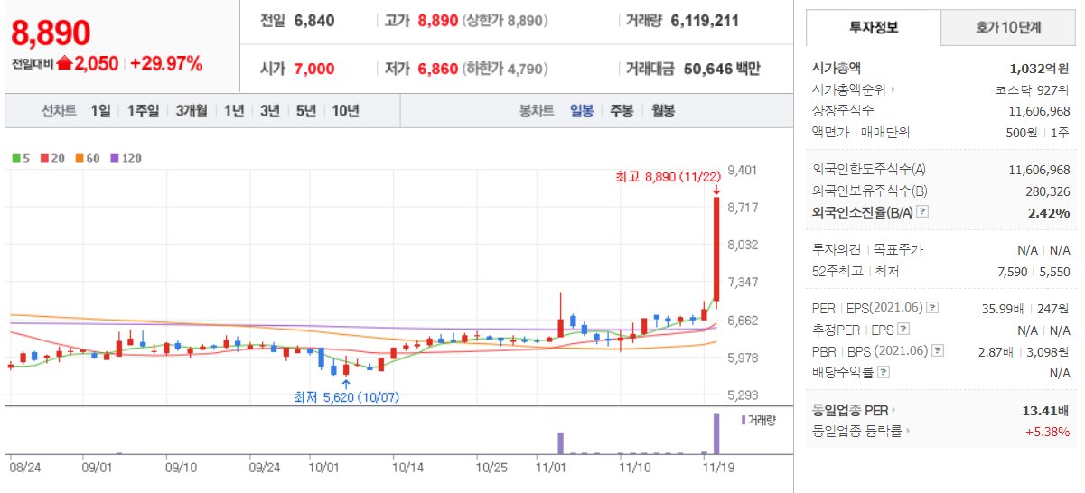 코이즈 ( 121850 : 코스닥 ) + 29.88 % - 11월 22일 장 마감 기준