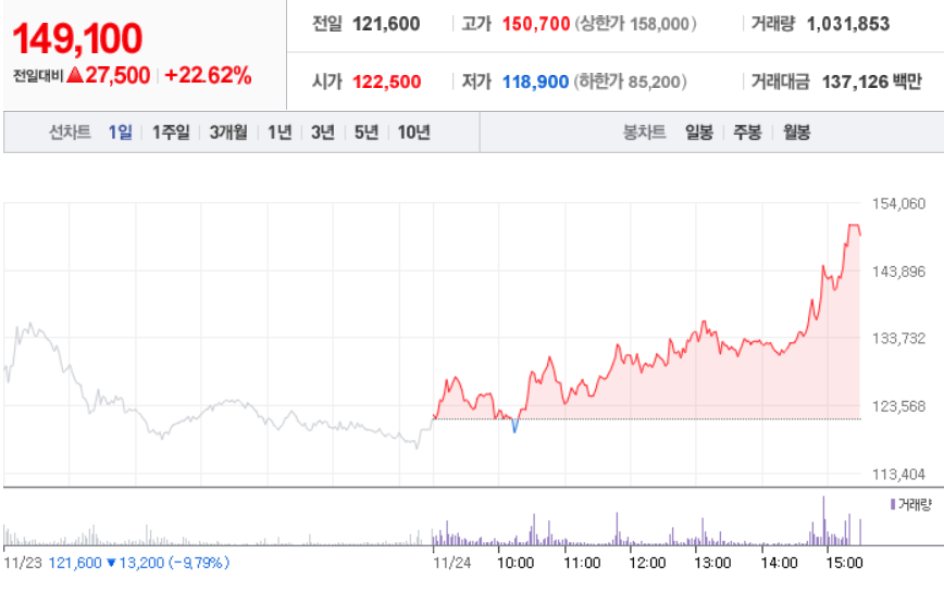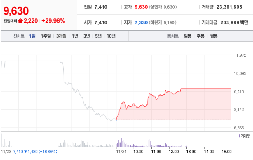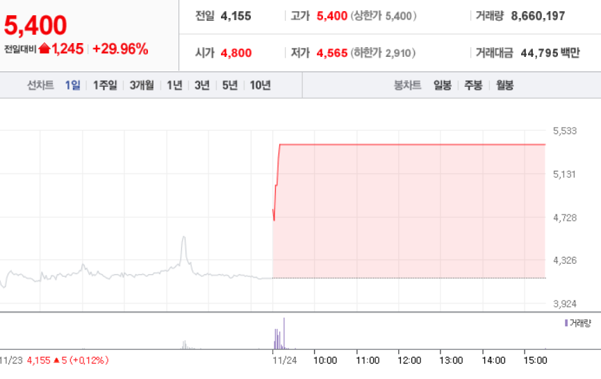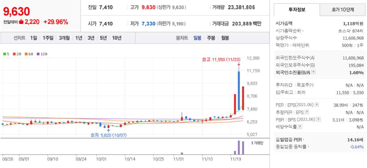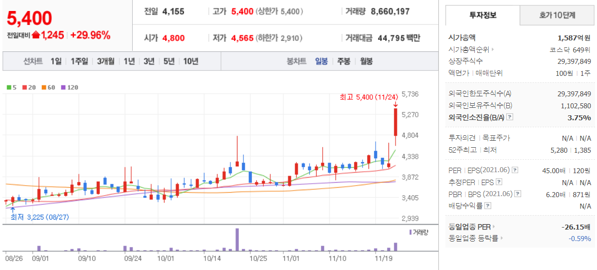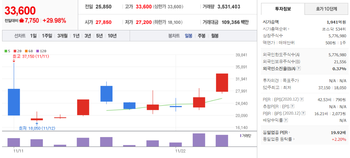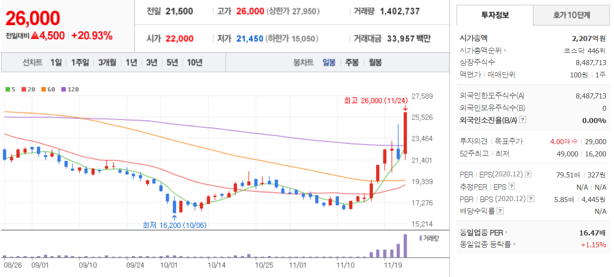애니플러스 ( 310200 : 코스닥 ) + 29.96 % - 11월 24일 장 마감 기준