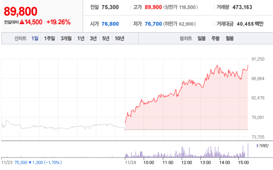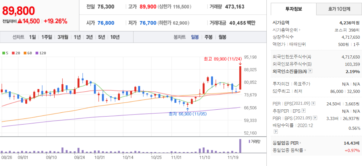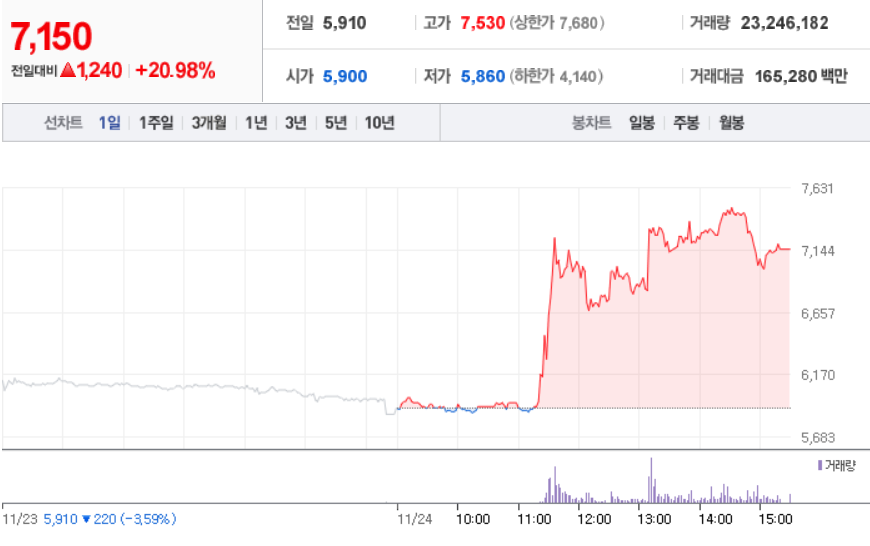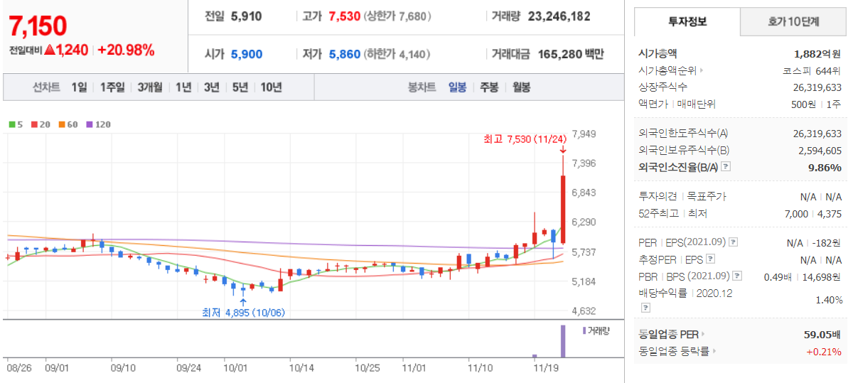 디와이 ( 013570 : 코스피 ) + 20.98 % - 11월 24일 장 마감 기준