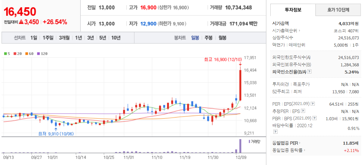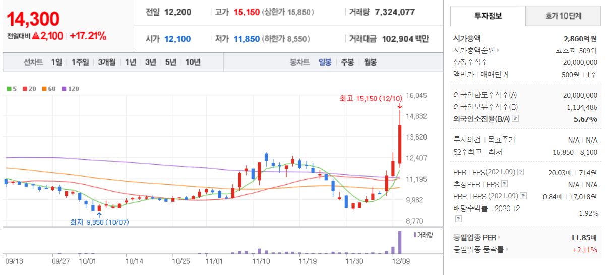 노루페인트 ( 090350 : 코스피 ) + 17.21 % - 12월 10일 장 마감 기준